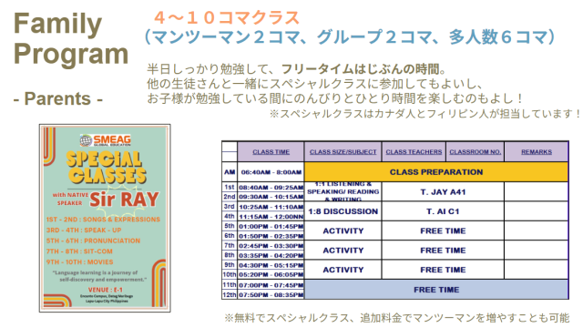 親御様のクラスはマンツーマン45分×2コマ、グループ2コマ、参加可否自由なカナダ人講師が担当しているグループクラスが最大6コマのご案内となります。