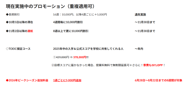 2025年10月・11月も、現在実施中の 留学プロモーション がそのまま継続されます。