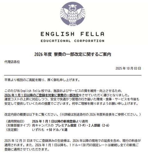 English Fellaでは、施設やサービスの質をさらに向上させるため、2026年1月1日以降のお申し込みから一部の寮費が改定されます。