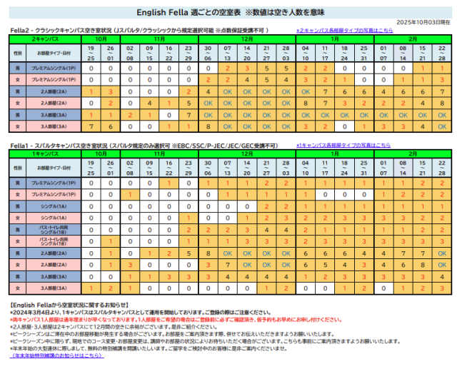 第2キャンパス:11月はほぼ満室。12月は比較的余裕あり。1月以降は女性3人部屋の残数が限られる見込み