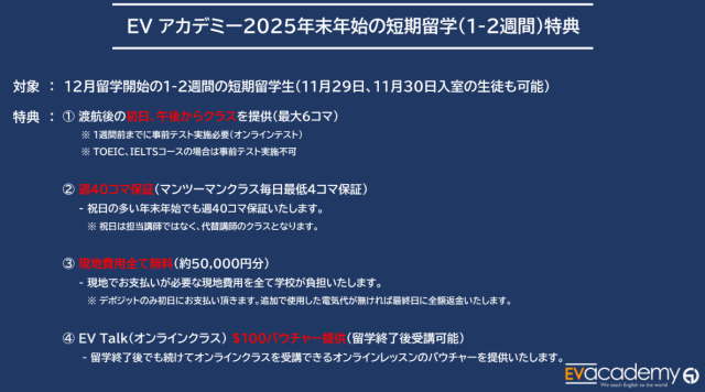 今年もEVアカデミーでは、年末年始限定の短期留学プロモーションを実施します。