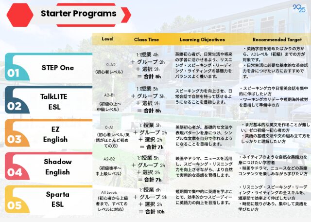 Starter Programは、スピーキング、リスニング、リーディング、ライティングをバランスよく学び、実践的な英語力を養うプログラムです。