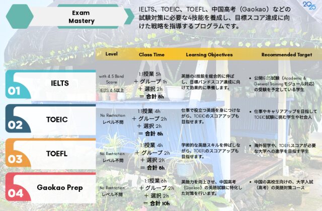 IELTS、TOEIC、TOEFL、中国⾼考(Gaokao)などの試験対策に必要な4技能を 養成し 、⽬標スコア達成に向けた戦略を指導するプログラムです。