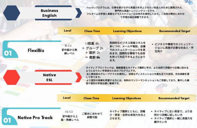 FlexiBizプログラムは、仕事を続けながら英語⼒を向上させたい社会⼈のために開発された、専⾨的な英語トレーニングコースです。