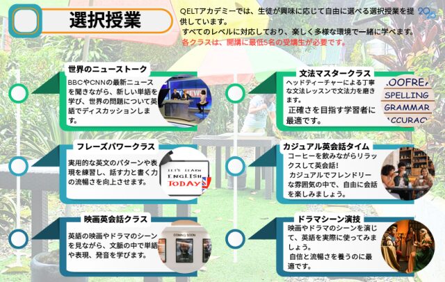 そして、多くの学校は土日がお休みですが、QELT土曜日に4時間のマンツーマン授業(8時~12時)とグループ授業(13時~15時)も無料で提供しており、毎月授業提供日が18日を下回る場合補講を用意する授業保証を行っております。