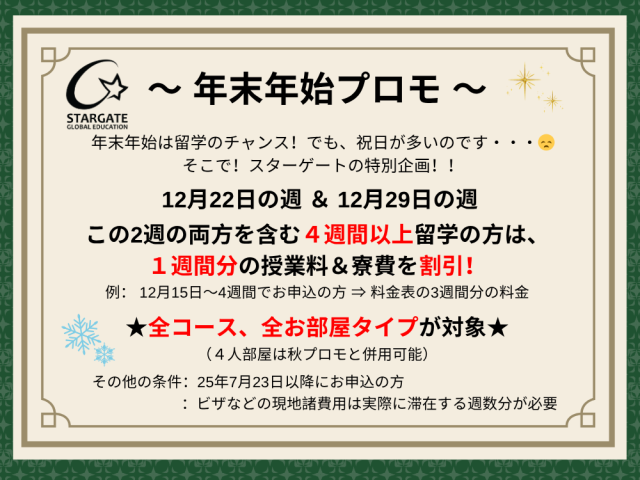 対象週:12月22日 or 12月29日を含む4週間以上の留学