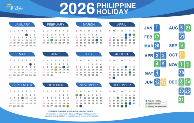 B’Cebuでは、2026年の年間スケジュール(祝日・学校休校日) が正式に確定しました。