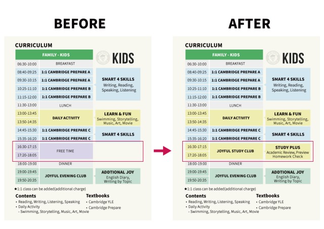 これまでジュニア向けプログラムに設定されていた「Free Time(自由時間)」は廃止され、新たに「JOYFUL STUDY CLUB」へと変更されます。