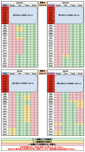 特に春休み・夏休み・年末年始などの繁忙期は、日々空き状況が変わるため要注意です。
