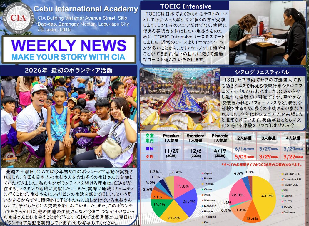 フィリピン・セブ島の人気語学学校CIA(Cebu International Academy)から、最新ニュースが届きました。