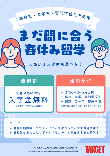 このたび、フィリピン語学学校 TARGET Global English Academy より、