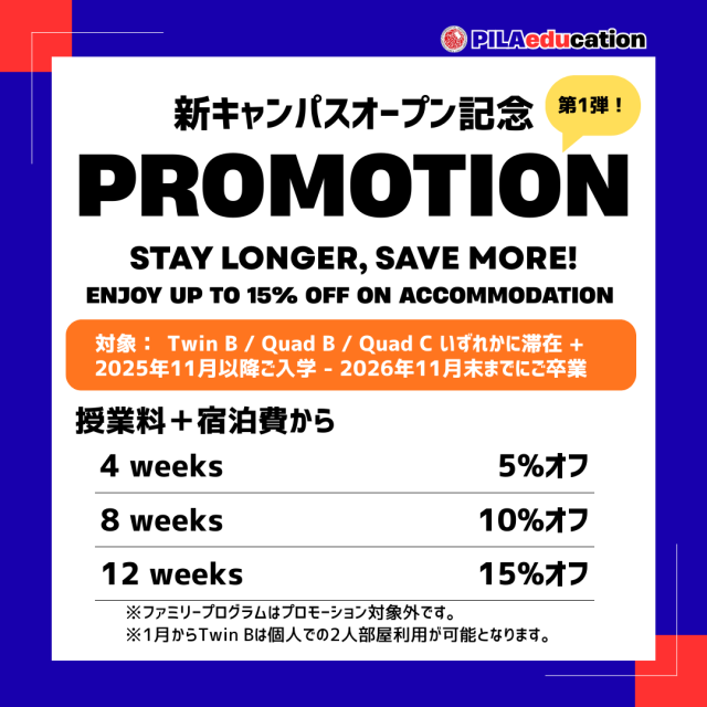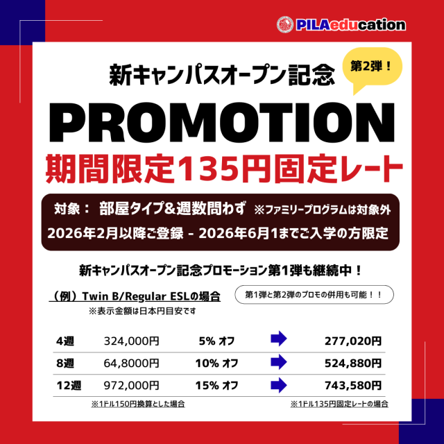 人気語学学校 PILA(ピラ) より、新キャンパスオープンを記念した【第2弾プロモーション】のご案内です。