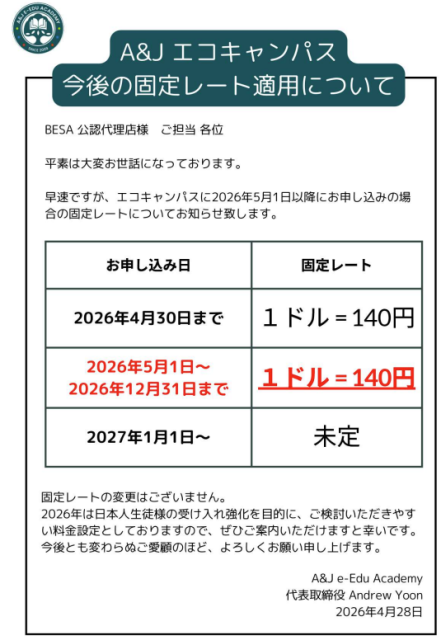 最近は為替が160円前後になることもあり、円安の影響で留学費用が高騰しています。その中でこのレート維持は、かなり魅力的な条件といえるでしょう。